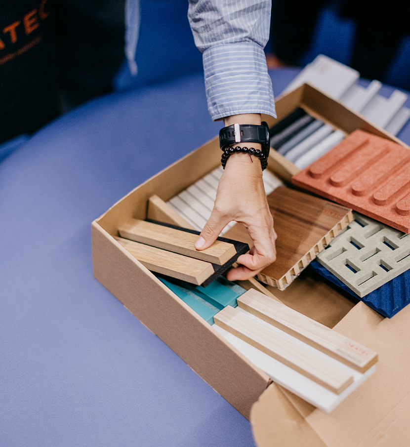 Protagonizada por Idealux FL en versión Flex, con lamas de melamina nogal y base de PET reciclado. En el techo, su versión fabricada completamente en PET aportaba una estética contemporánea y un excelente rendimiento acústico.